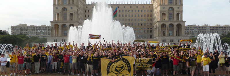 The game was started very offensively by Agdam, but after a few minutes they reached their limits, so it became a bit boring, because Borussia didn´t do more than necessary. But when Lucas Barrios scored in the last minute, it was a perfect end for a nice away-support. After the game the whole team including the coach and CEO Aki Watzke celebrated the qualifying for the Euro-League in front of the away sector, so everyone left happy. At the parking place first we had to deal with group of ca. 100 local kids and youths (I calmed them down by giving an old BVB-Cap to the largest of them), and then the buses took us directly to the airport.