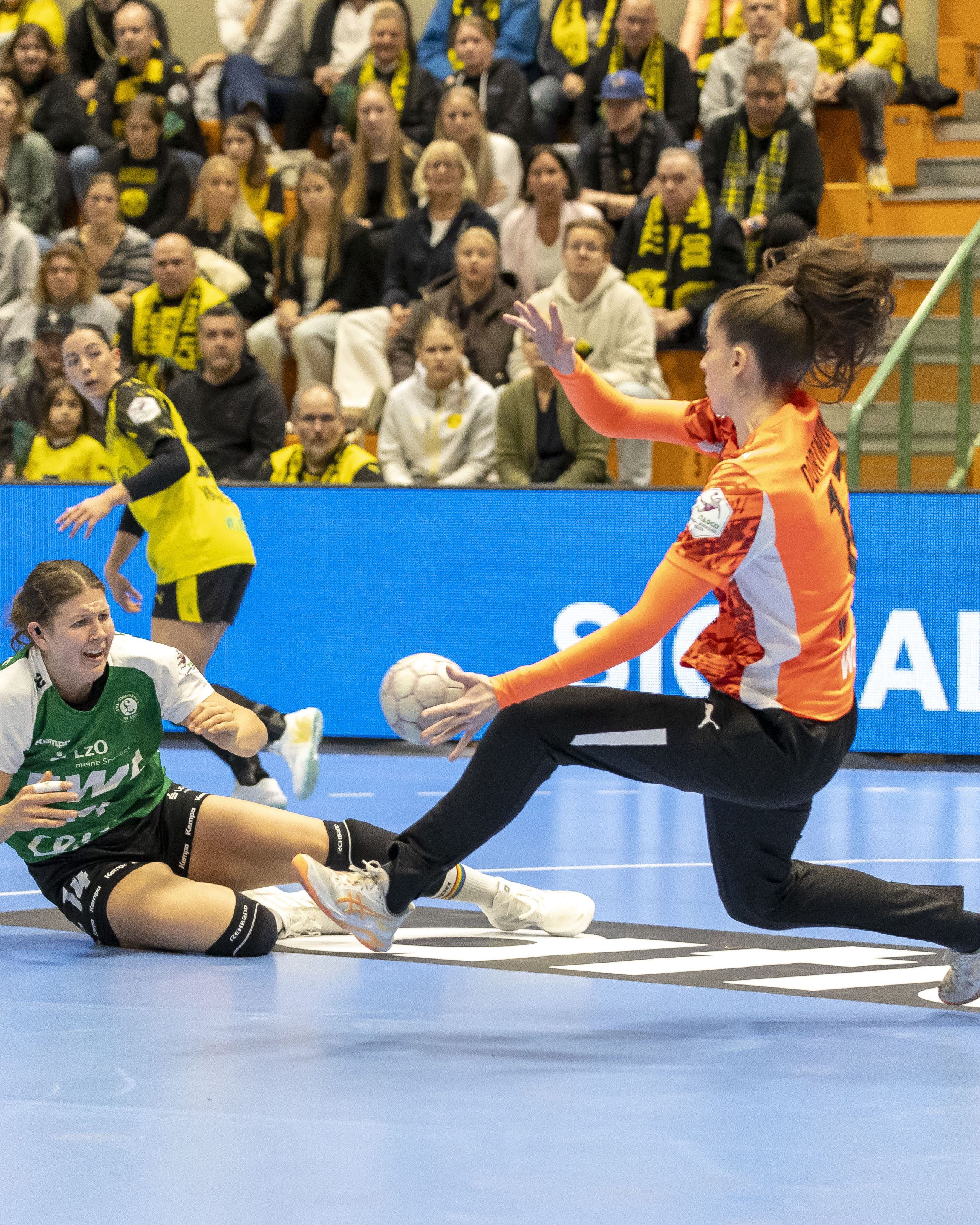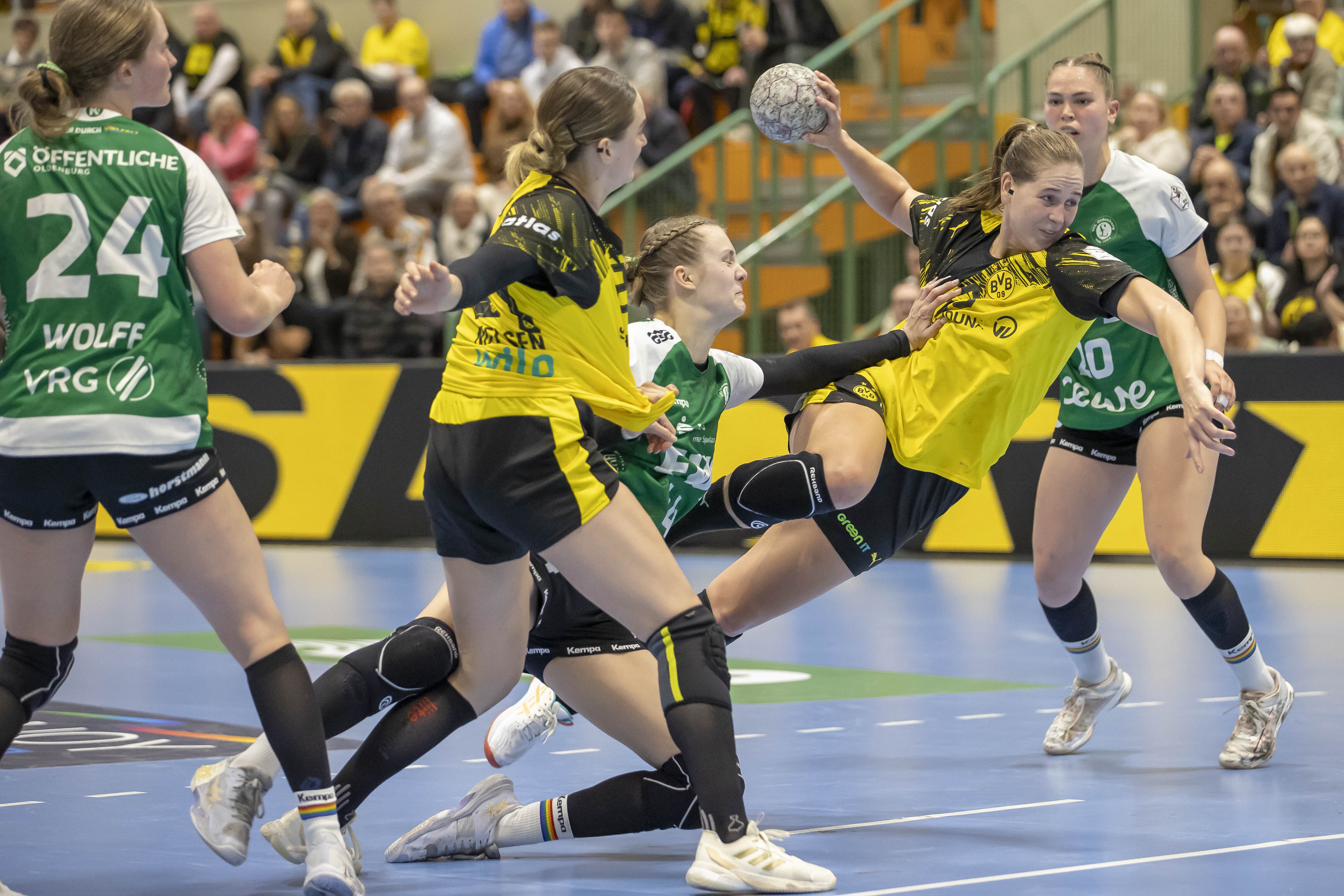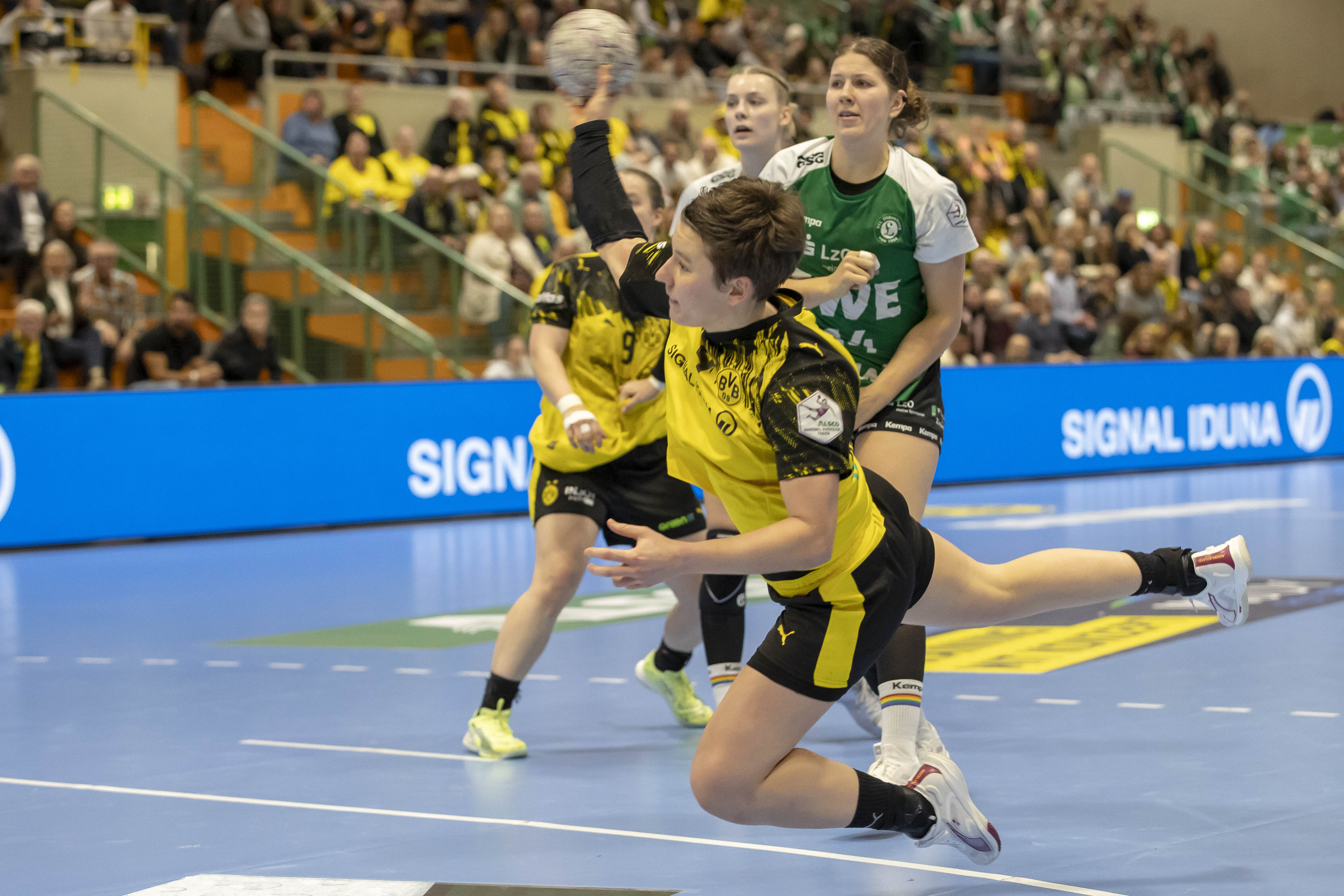 Die Spielerinnen des BVB waren gerade auf das Feld gelaufen, da war das Erlebnis „LED-Videowand” schon wieder vorbei. Man konnte sich nicht einmal 30 Sekunden an der neuen Errungenschaft erfreuen, dann war wieder ein Blackout eingetreten und die alte Technik musste herhalten. Vielleicht klappt es ja beim dritten Versuch. Auch bei unseren Spielerinnen auf der Platte wollte es nicht so recht klappen. Die Gäste gingen in Führung, doch dank Guro Nestaker und Alina Grijseels stand es nach 18 Minuten 6:6 – es war ein wilder Wechsel zwischen Fehlwürfen auf unserer Seite und Glanzparaden von Sarah Wachter. Insgesamt prägten zehn Fehlwürfe das Spiel unserer Mannschaft. Erst die beiden für die Handball-WM nominierten Spielerinnen Alina Grijseels und Lisa Antl sorgten in den letzten fünf Minuten der ersten Hälfte für die Vorentscheidung. Einem Dreierpack von Lisa Antl zwischen der 26. und 28. Minute folgten zwei Treffer von Alina in der 29. und 30. Minute, sodass es zur Halbzeit 13:8 für die Schwarzgelben stand.