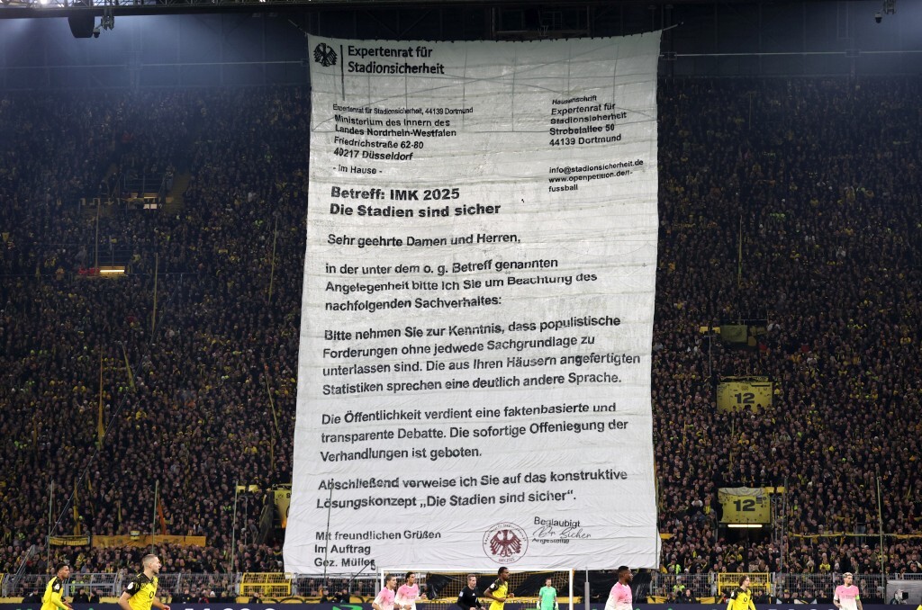 Leverkusen macht sich bei den Heimfans noch unbeliebter als ohnehin schon und tauscht nach der Platzwahl die Seiten. Nach dem ersten Pfeifkonzert des Abends kehrt im Westfalenstadion schnell Ruhe ein, die wie in den Spielen zuvor zwölf Minuten andauert. Die Südtribüne bzw. der „Expertenrat für Stadionsicherheit“ meldet sich per übergroßem Schreiben beim NRW-Innenministerium und macht einmal mehr klipp und klar deutlich, dass die „populistischen Forderungen“ der Ministerinnen und Minister „jedwede Sachgrundlage“ vermissen lassen.