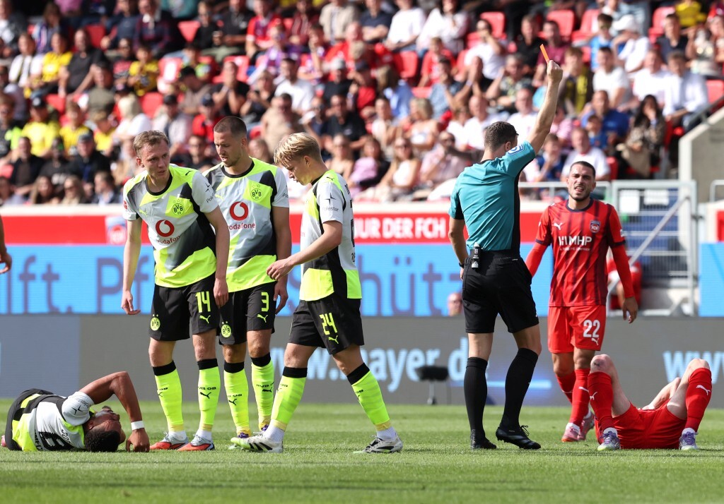 Nach zweiundzwanzig Minuten war dann für den nächsten Heidenheimer Feierabend. Budu Zivzivadse (hihi) wollte Nmecha den Ball weggrätschen, traf ihn aber stattdessen mit offener Sohle seitlich am Wadenbein. Eine Szene, die derart eindeutig war, dass sie selbst Schiri Zwayers zweifelhafte Fähigkeiten nicht überstieg und konsequent mit der roten Karte bestraft wurde.