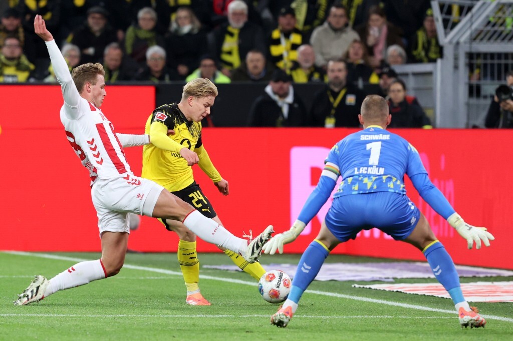 Danach dauerte es etwas, bevor es das nächste Highlight zu sehen gab. Zwar hatte der BVB das Spiel im Griff und machte einen insgesamt guten Eindruck (einzig Anton fiel in der ersten Halbzeit immer mal wieder negativ auf), brachte aber auch nicht allzu viel zustande. Außer ein paar spektakuläre Verteidigungslücken. Während die ersten zwei Male der Kölner Spieler gerade noch rechtzeitig abgefangen werden konnte, lief er beim dritten Mal alleine auf Kobel zu. Der darf sich seinen Teil beanspruchen an der Tatsache, dass dies kein Tor geworden ist, der größte Dank geht allerdings an den Kölner Stürmer, der den Ball neben den Pfosten setzte. Das war sie dann auch, die größte und beinahe auch letzte Chance der Gäste.