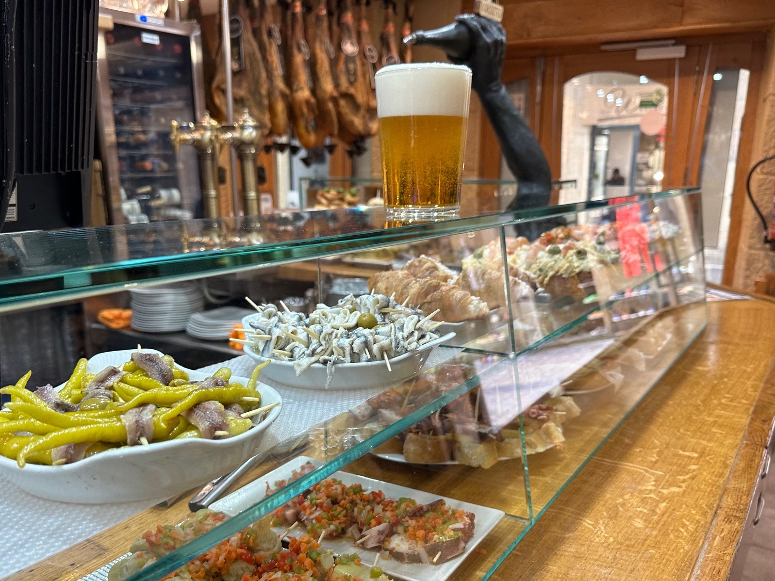 Spieltag, noch entspannte 23 Grad. Bilbao ist bekannt für Pintxos, die Tapas der Basken. Kleine Spieße mit Chorizo, Garnelen und allem, was die spanische Küche sonst so hergibt. Überall im Stadtgebiet werden sie verkauft. Immer dazu: wahlweise ein kühles Bier oder Tinto de Verano. Eine Kombination wie gemacht für Dortmunder Fußballfans.