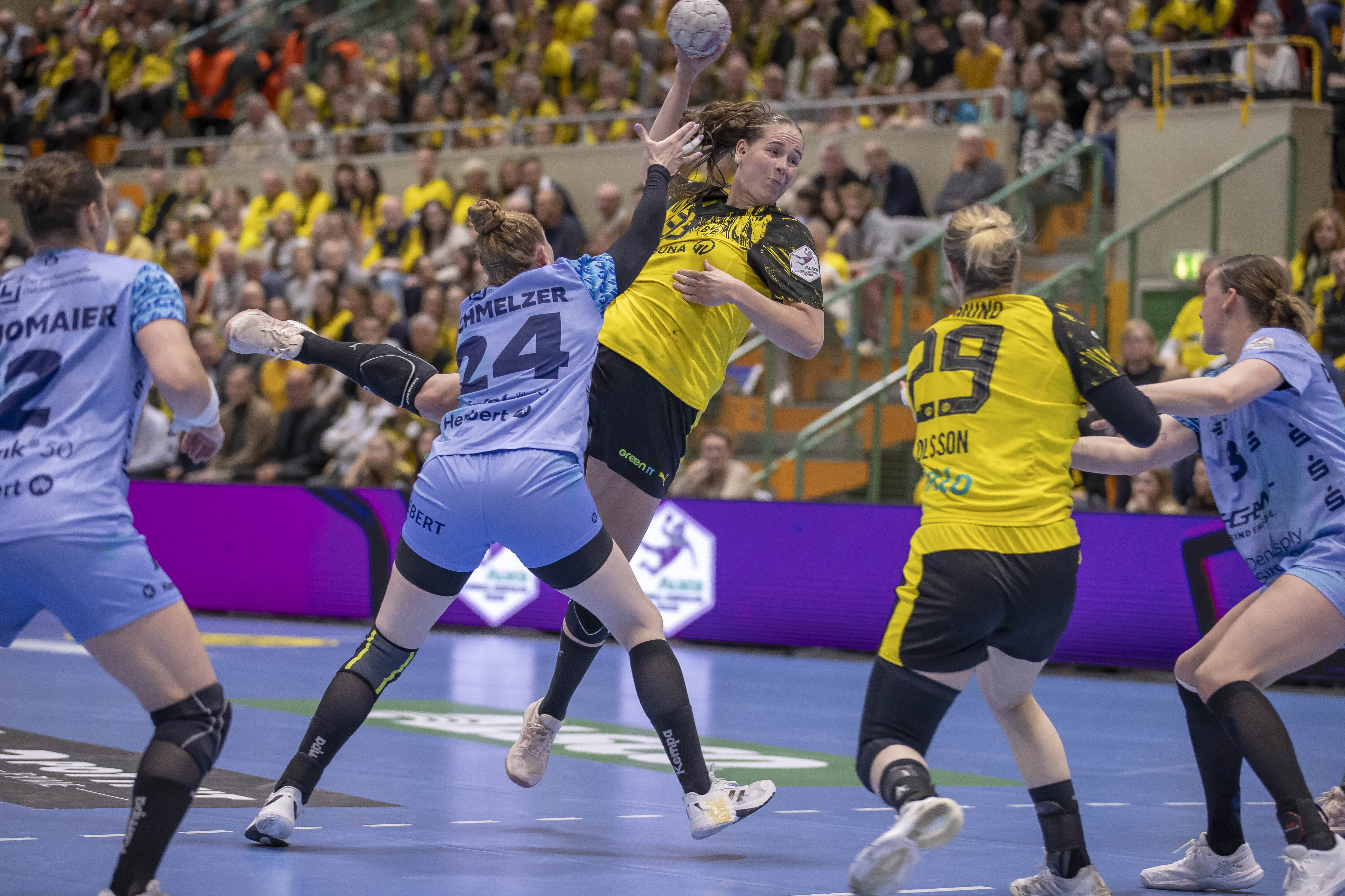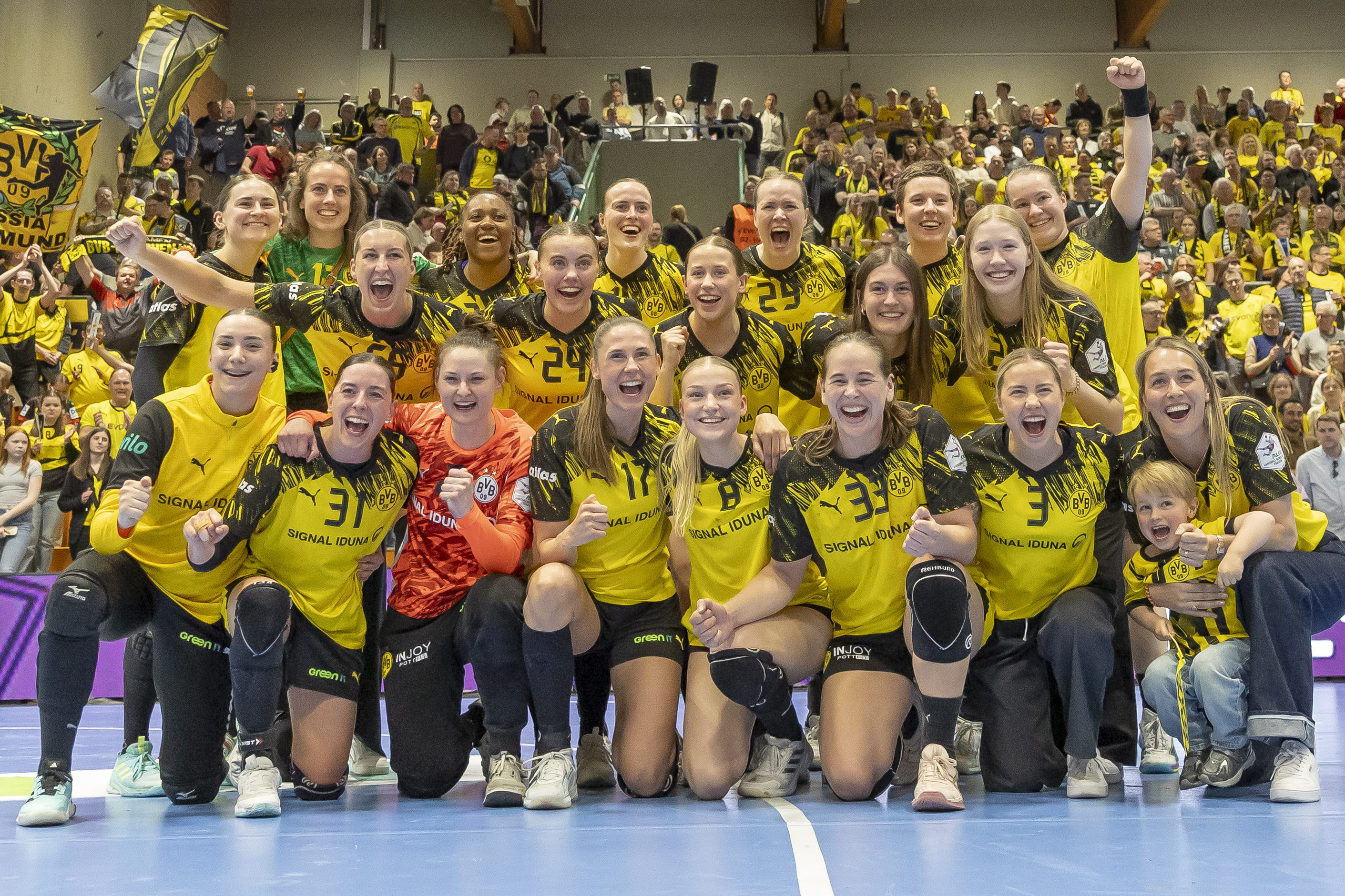 Doch wie im gesamten Spielverlauf hatten die Zuschauer ein gutes Gespür für die Situation und feuerten ihr Team mit stehenden Ovationen an. Es sollte von Erfolg gekrönt sein. Drei Minuten vor Schluss erzielte Guro Husebo das 34:31, diese Führung ließen sich die Borussinnen nicht mehr nehmen. Melinda Szikora glänzte noch einmal und entschärfte eine „Hundertprozentige“. So endete die erste Playoff-Partie mit 34:32 für unsere Borussinnen. Die Halle kochte. Déborah Lassource war mit acht Treffern die erfolgreichste Werferin, je fünf Mal trafen Guro Husebo und Emma Olsson, gefolgt von Guro Nestaker mit vier Torerfolgen.