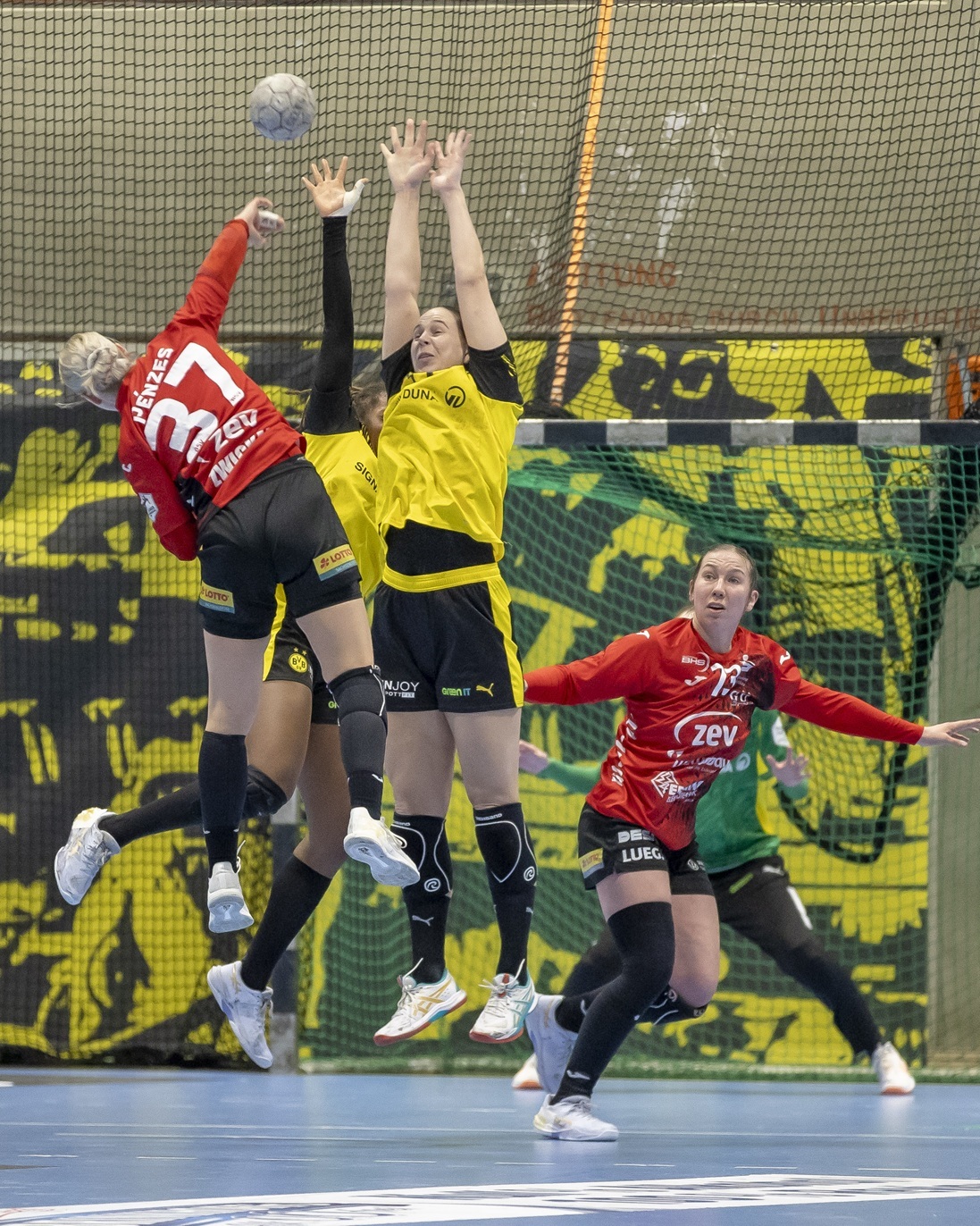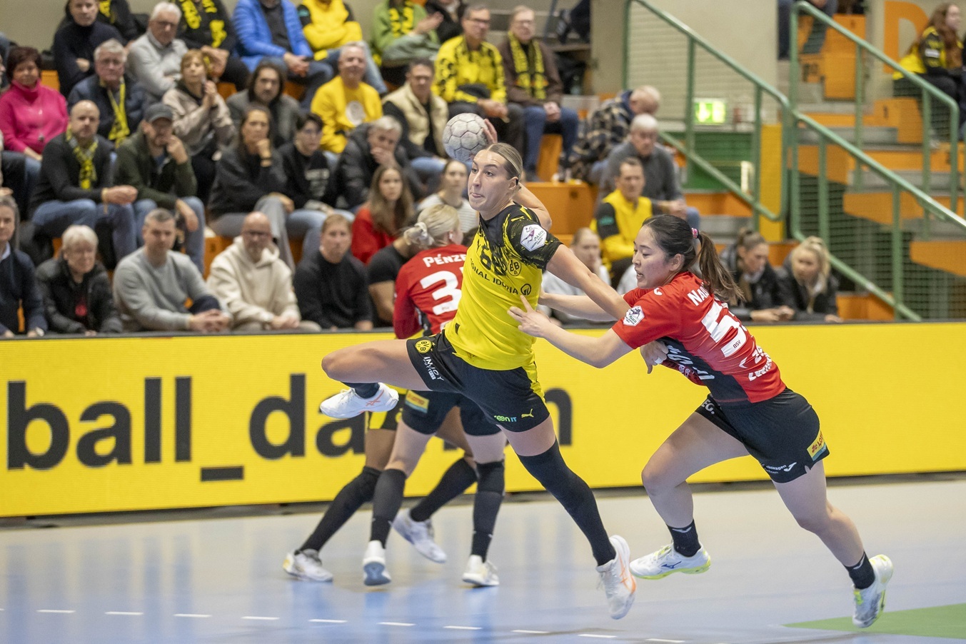 Doch die Schwarzgelben spielten dominant weiter, sodass es nach gut 13 Spielminuten bereits 10:3 stand. Die Gäste stemmten sich erfolglos gegen einen noch höheren Rückstand, da die Dortmunderinnen konsequent weiterspielten und durch Kaja Kamp Nielsens Treffer zum 18:8 erstmalig in dieser Partie mit zehn Hütten in Führung gingen (22.). Und die nächsten Tore folgten sogleich. So traf Kaja Kamp Nielsen zunächst zum 19:8 (23.), ehe Guro Nestaker auf 20:8 erhöhte (26.). Den letzten Treffer in der ersten Hälfte erzielte Déborah Lassource zum 22:10-Halbzeitstand (30.).