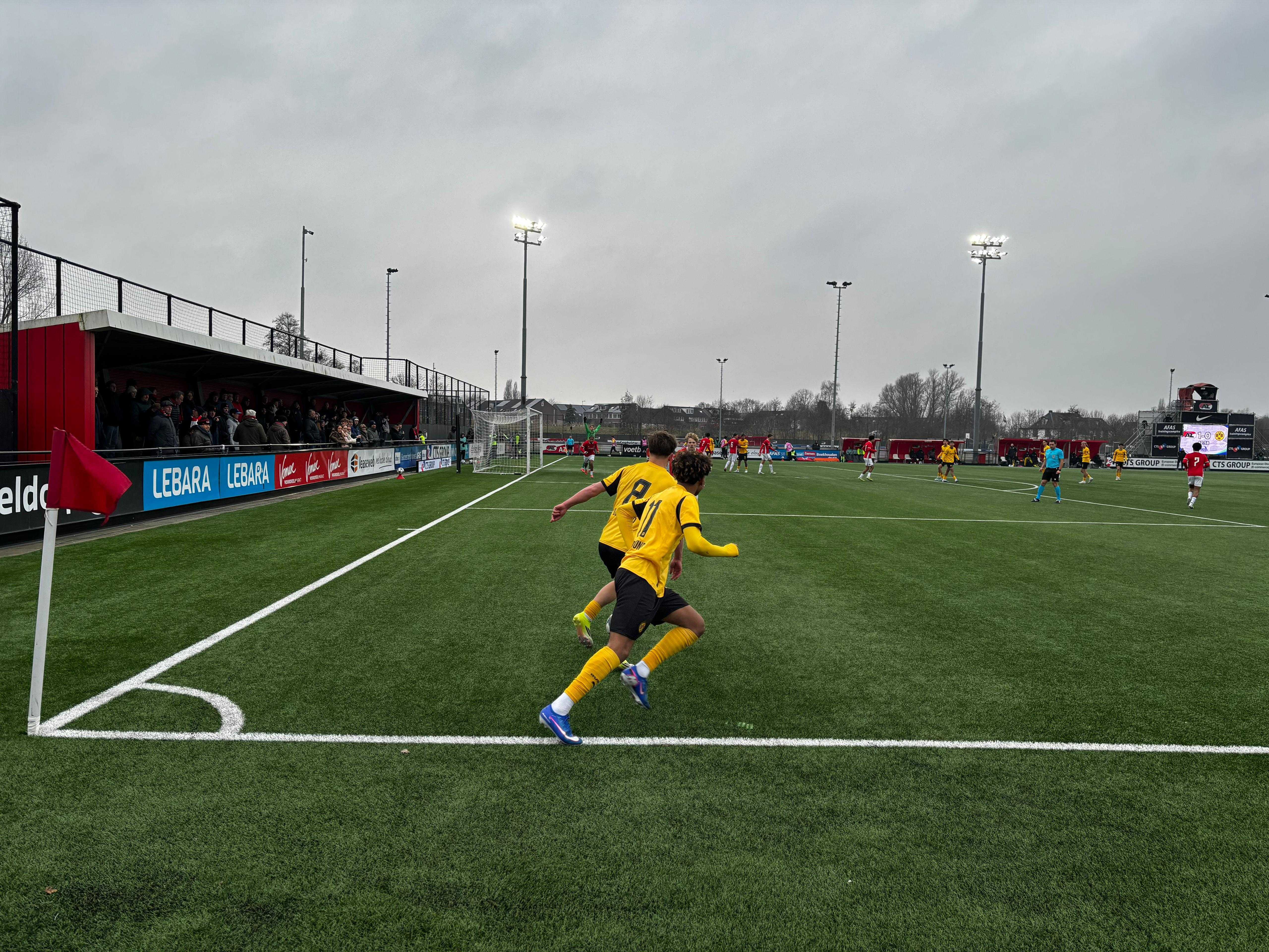 Bei Temperaturen um den Gefrierpunkt traf die U19 der Borussia im ersten Pflichtspiel des Jahres 2026 auf den Sieger der Saison 22/23 aus Alkmaar. Schon beim Gang auf den Platz wurde die Wichtigkeit des Spiels unterstrichen – insbesondere für Alkmaar, dessen Fans auf einem Hügel in der Nähe mehrere Bengalen sowie einen Haufen Raketen in die Luft zündeten.