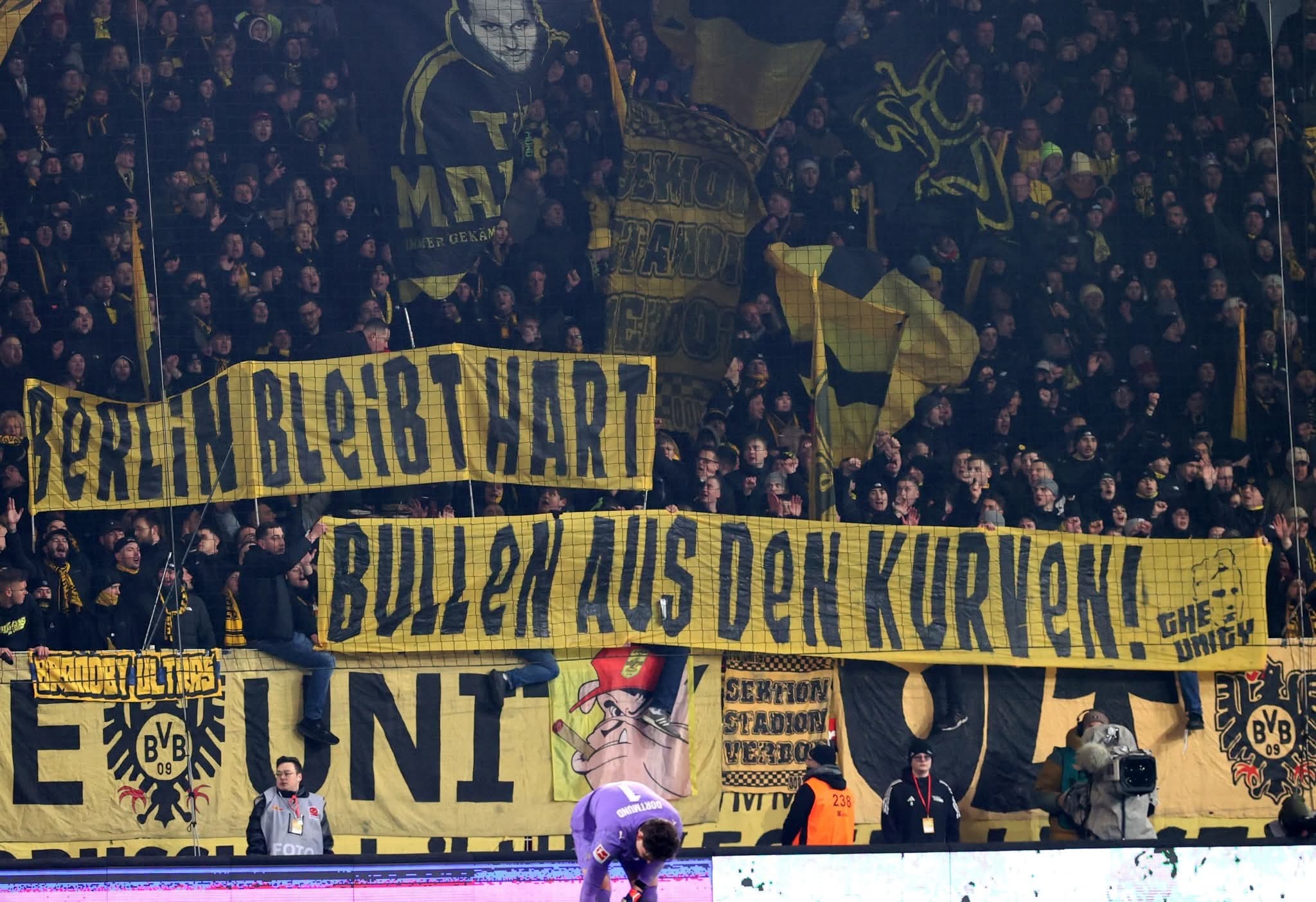 Eines der Dortmunder Spruchbänder gegen den Polizeieinsatz am vergangenen Spieltag bei Hertha BSC