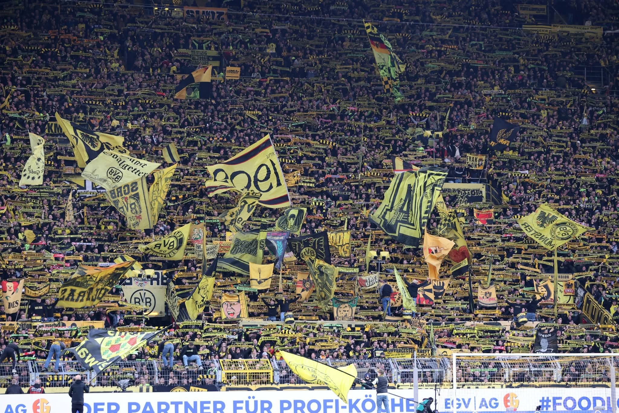 Am Mittelkreis fand sich heute nicht gewohnt das BVB-Wappen wieder, sondern eine riesige 100, die das Jubiläum der Roten Erde zelebrierte. Passend dazu liefen die sonst Schwarzgelben heute im schwarzen Sondertrikot auf. Im Gästeblock wehten zum Anpfiff schwarze und blaue Fahnen, die von einer Reihe Pyrofackeln flankiert wurden. Zumindest auf der Nord dürfte man in den ersten Minuten nicht viel gesehen haben.