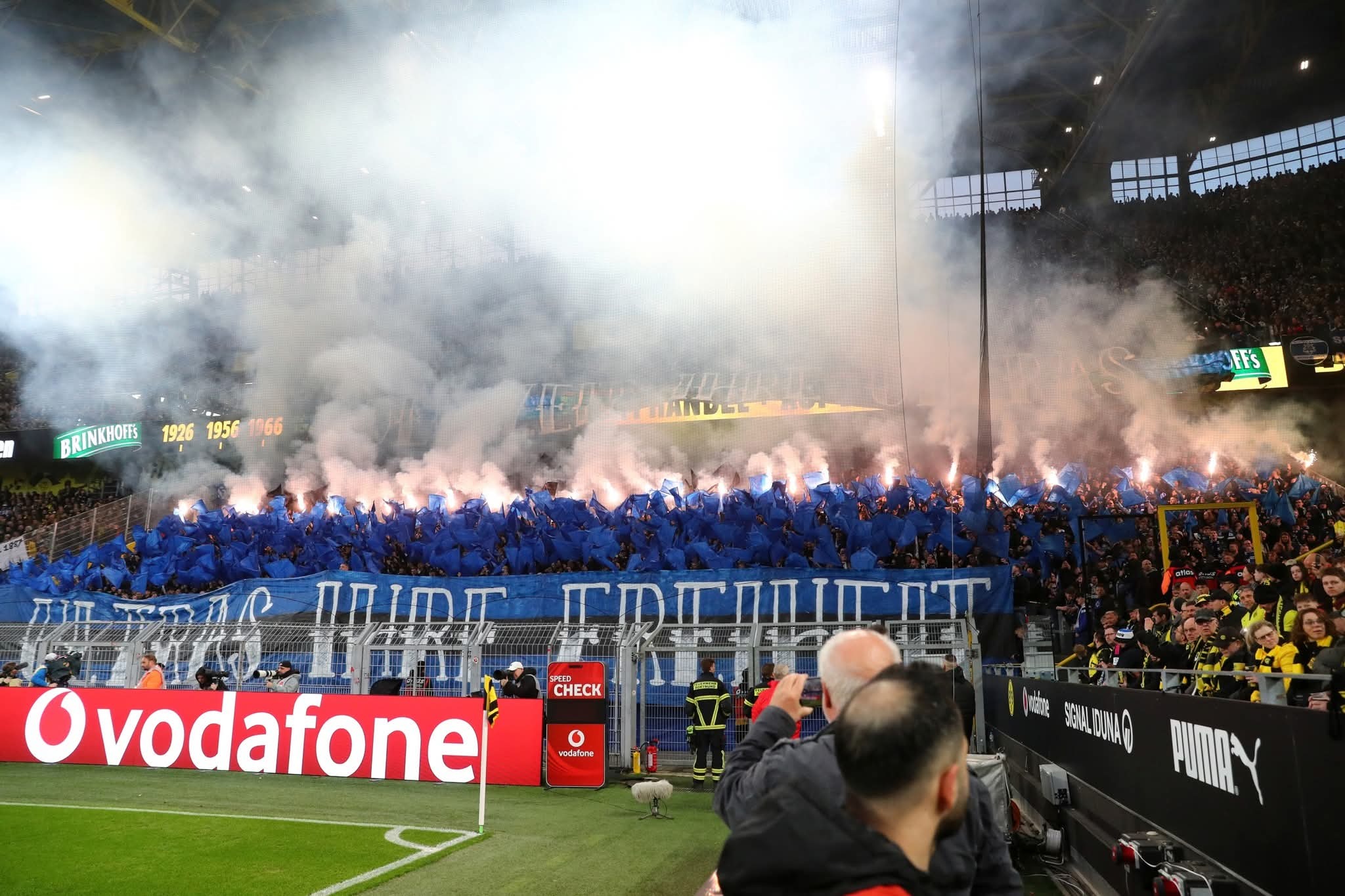 Acht Jahre lang war der einstige Bundesliga-Dino von der Bildfläche der Bundesliga verschwunden und zum ersten Mal wieder zu Gast im wunderschönen Westfalenstadion. Und der mitgereiste schwarz-blaue Mob hatte Bock und war stimmungsvoll unterwegs. Ein breites und ansehnliches Repertoire an Pyro-Shows, Schmähgesängen und Hamburg-Beweihräucherung fegte die gesamten 90 Minuten von der Nordtribüne über das Feld – ich habe schon schlechtere Auswärtssupports erlebt. Und nicht nur auf der Tribüne wurde ordentlich gezündelt, auch vor unserem Tor fackelte man nicht lange. Aber der Reihe nach.