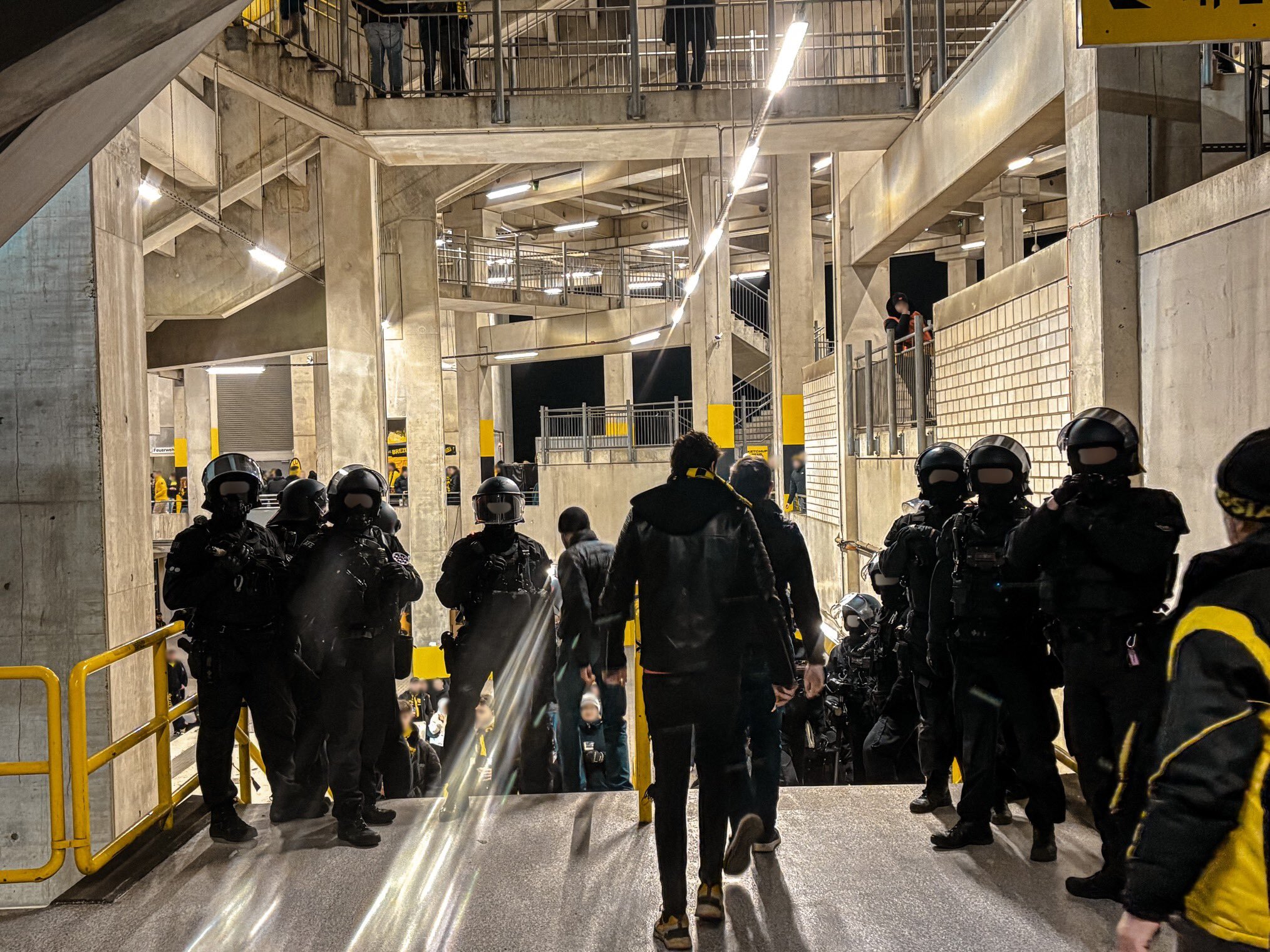 Wer in den vergangenen Wochen das Westfalenstadion besucht hat, konnte insbesondere im Stadionumfeld und im Umlauf ein Polizeiaufgebot erleben, das in dieser Form selbst langjährigen Beobachtern ungewöhnlich erscheinen musste. Exemplarisch steht dafür das Heimspiel gegen den 1. FSV Mainz 05 am 13.02.2026. Hier waren behelmte und vermummte Einsatzkräfte nicht nur im Bereich des Nordwest-Eingangs positioniert, sondern begleiteten die aktive Fanszene bis weit in das Stadioninnere hinein. Dort postierten sich die Einsatzkräfte bis zur Treppe, die auf die unterste Ebene vor die Südtribüne führt.